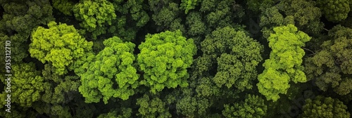 An aerial view of a dense green forest canopy with varying shades of green trees, showcasing the natural beauty of untouched wilderness.