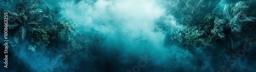 An aerial view of a dense jungle landscape in Thailand during a war, shrouded in a deep blue fog that enhances the mystery and tension of the scene