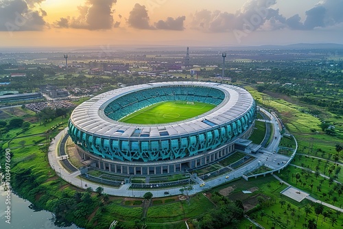 An aerial view of a large, modern stadium surrounded by lush greenery.