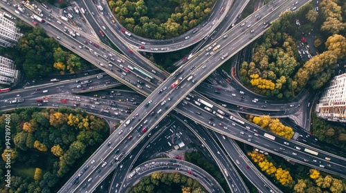 An aerial view of a major highway interchange with heavy traffic, showcasing the complexity of road transportation and traffic management.