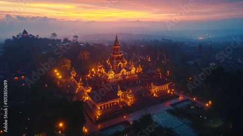 An aerial view of a temple complex illuminated at sunrise with fog rolling in over the surrounding forest.