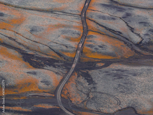 An aerial view of a winding road traversing a barren volcanic terrain in Iceland, featuring dark gray and orange hues from ash and moss or lichen.