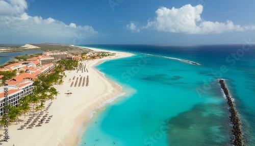 An aerial view of Aruba's famous beach, Ko Beach in Palm Beach, showcasing the white sandy shore and turquoise waters