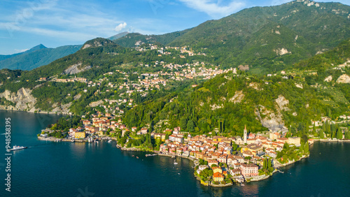 An aerial view of Varenna, a renowned tourist destination on the shores of Lake Como, Italy, captured by a drone. This famous village is celebrated for its colorful buildings, historic sites