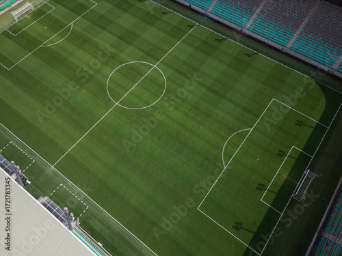 An aerial view showcases a well-maintained soccer stadium's playing field, ready for an exciting match.