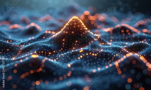 An aerial view shows a low-poly digital mountain range, highlighting connection and communication.