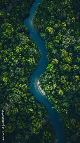 An aerial view shows a stunning river meandering through a lush, dense forest canopy