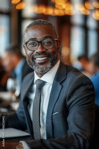 An African American business man wearing glasses and a gray suit with an tie in white shirt, in a modern office setting. authority and sophistication, leadership or business related uses.
