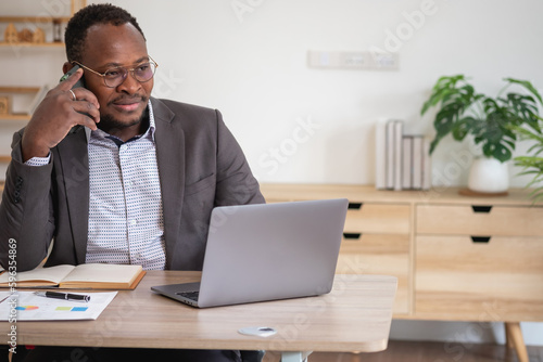 An African American businessman in a black suit uses a mobile phone to communicate with clients and a laptop to view company profits. to build confidence for customers to come and invest in the office