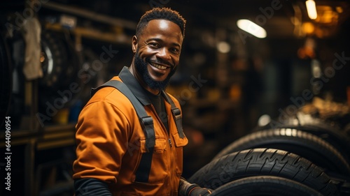 An African American mechanic is balancing a tyre using wheel balancing equipment in an auto repair shop..