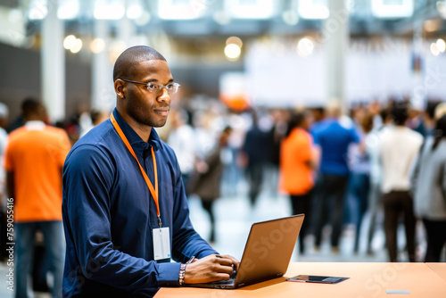 An African American professional uses his laptop at a bustling job fair, representing proactive job market engagement and the pursuit of corporate success on Labor Day