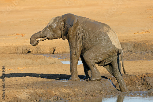 An African elephant (Loxodonta africana) in a muddy waterhole, Chobe National Park, Botswana.