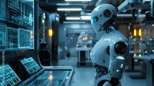 An AI robot gazes at its reflection in a sleek, high-tech science lab, surrounded by futuristic equipment and glowing screens, pondering its existence.