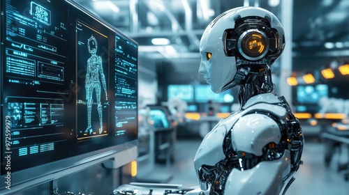 An AI robot gazes at its reflection in a sleek, high-tech science lab, surrounded by futuristic equipment and glowing screens, pondering its existence.