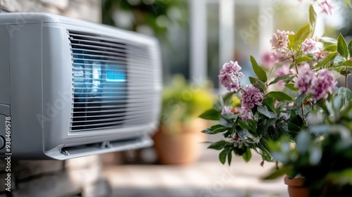 An air purifier sits beside flowers, creating a serene and fresh ambiance, showcasing the combination of technology and natural beauty for cleaner air in the space.