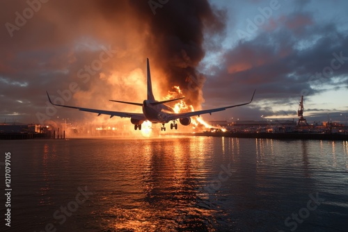 An aircraft embarks on its journey through a dramatic sky filled with smoke and flames at sunset, showcasing the intensity and gravity of aviation operations.