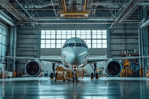 An airplane in a hangar with the front of the plane facing the camera. This photo captures the essence of a well-maintained airplane in a secure and professional setting.