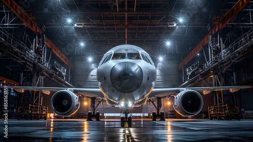 An airplane in the hangar, wide-angle lens, symmetrical composition, bright lighting, high contrast between white and gray colors, surrounded by steel beams and industrial equipment.