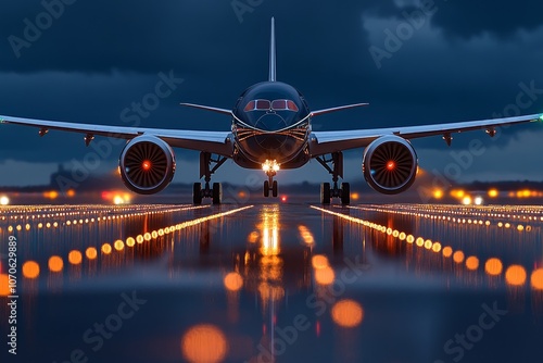 An airplane landing on a runway at night, with its lights illuminating the runway markings