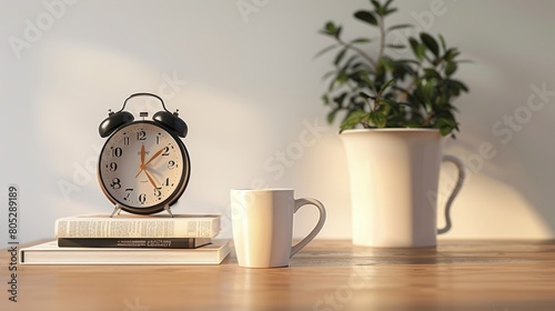 An Alarm Clock, Book, and Coffee Mug Poised on a Wooden Table Against a White Background