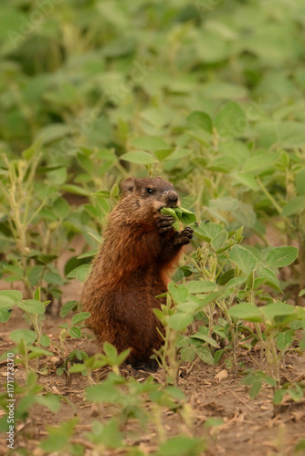 An alert cute baby groundhog sitting up on its back legs damaging crops on a bean field