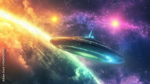 An alien civilization's massive spacecraft orbiting a distant planet, with colorful auroras and a two-sun sky illuminating the scene