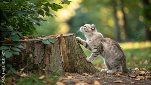 An american curl cat scratching a tree stump in a natural outdoor environment showcasing unique textures.