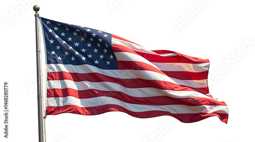 an American flag waving gently, isolated on a pure white background
