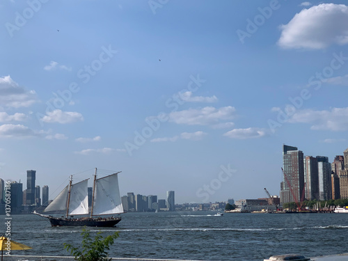 An ancient manpowered sailing ship clashes with the modern skylines of New York City.