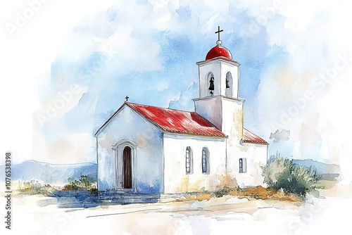 An ancient Nicola from the Breach church with traditional belfry wall in the city of Pskov, Russia. Watercolor painted sketch