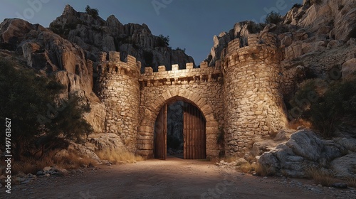 An ancient stone castle gate stands open wide at night, illuminated by soft moonlight.