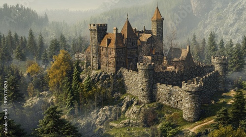 An Ancient Stone Castle Perched Atop a Misty Mountain