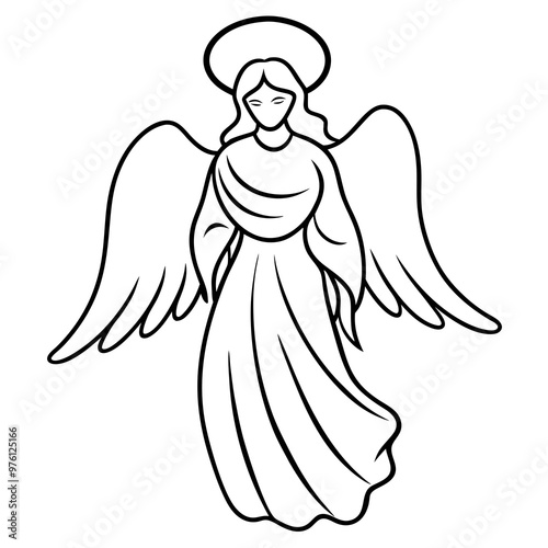 An angel with wings, halo, and a flowing robe, shown in elegant, minimalist lines vector