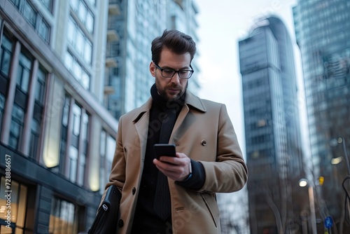 An annoyed businessman walking in the city while looking at his smartphone