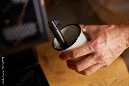 An Anonymous Barista Making a Cappuccino in a Coffee Chop, Male barista hand making espresso from ground coffee maker at modern cafe