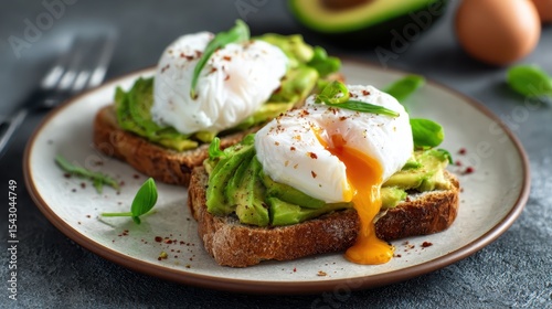 An appetizing close-up of avocado toast topped with perfectly poached eggs and fresh greens, emphasizing healthy eating and culinary artistry.