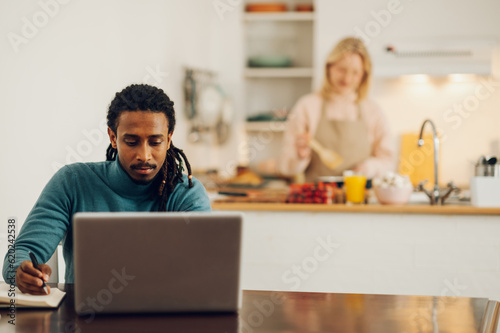 An Arabic freelancer is sitting at home and working on a project on a laptop at the dining table while his spouse is cooking dinner.