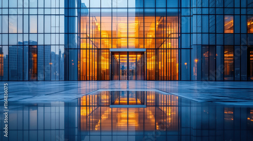 An architectural photograph of an office building with a glass facade, a symmetrical composition
