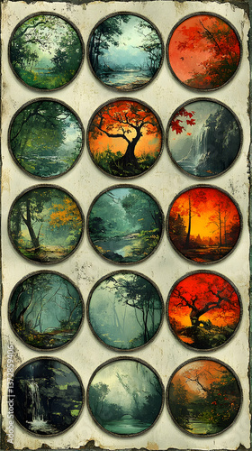 An arrangement of circular paintings depicting different landscape scenes with lush forests serene rivers and vibrant