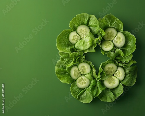 An arrangement of lettuce, cucumbers, and green onions forming a glowing fourleaf clover shape