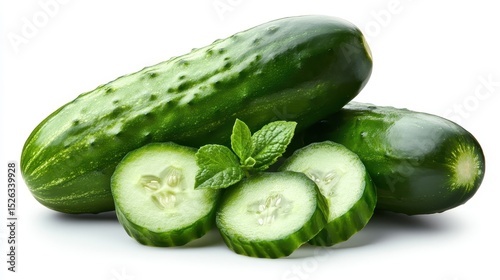 An array of fresh cucumbers accompanied by mint and sliced sections, highlighting the natural freshness and healthiness of these crisp vegetables in a vibrant layout.