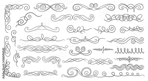 An array of ornate, hand-drawn swirl and flourish design elements, including corners and dividers, on a white background.