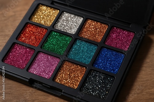 An array of shimmering eyeshadows in a black palette, each offering a unique hue from fiery reds to cool blues and metallic golds