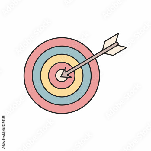 An arrow successfully hitting the bullseye of a circular target with pastel colored rings, symbolizing achievement and precision.