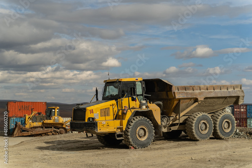 An articulated dump truck waiting to be repaired stands near the containers at the gold mine site.