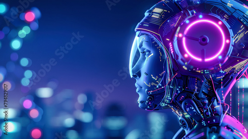 An artificial intelligence robot with headphones and colorful glowing elements on a dark background