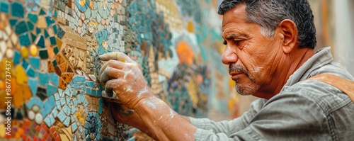 An artisan creating a mosaic mural for a community center, depicting scenes of local culture and heritage.