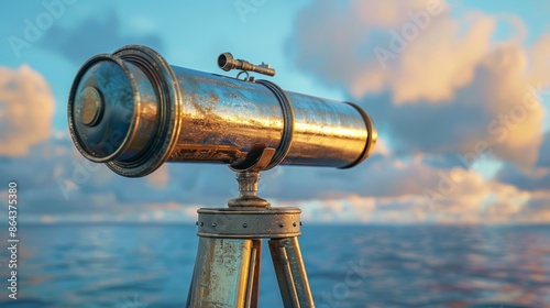 An artistic 3D rendering of a telescope pointing towards a cloudy sky, symbolizing the search for new discoveries in astronomy.