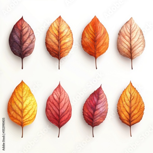 An artistic arrangement of colorful autumn leaves on a white background.