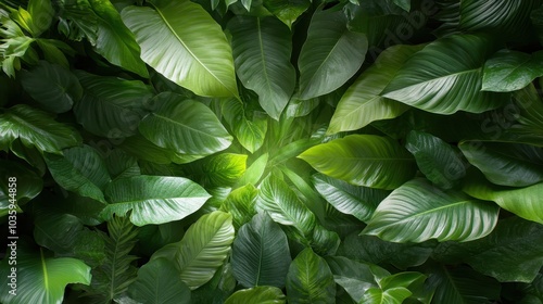 An artistic arrangement of lush, overlapping leaves, capturing the essence and beauty of a rainforest environment with rich textures and shades of green.